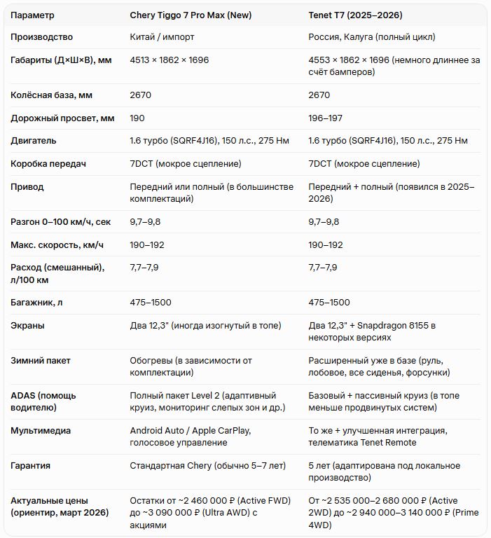 Примечание к ценам: Цены на Chery Tiggo 7 Pro Max — это распродажа остатков с существенными скидками, кредитами и trade-in. Tenet T7 предлагается как новая модель с более стабильным наличием. Точные цифры зависят от дилера, региона и акций — проверяйте у Major, АвтоГермес, Tenet-дилеров и др.