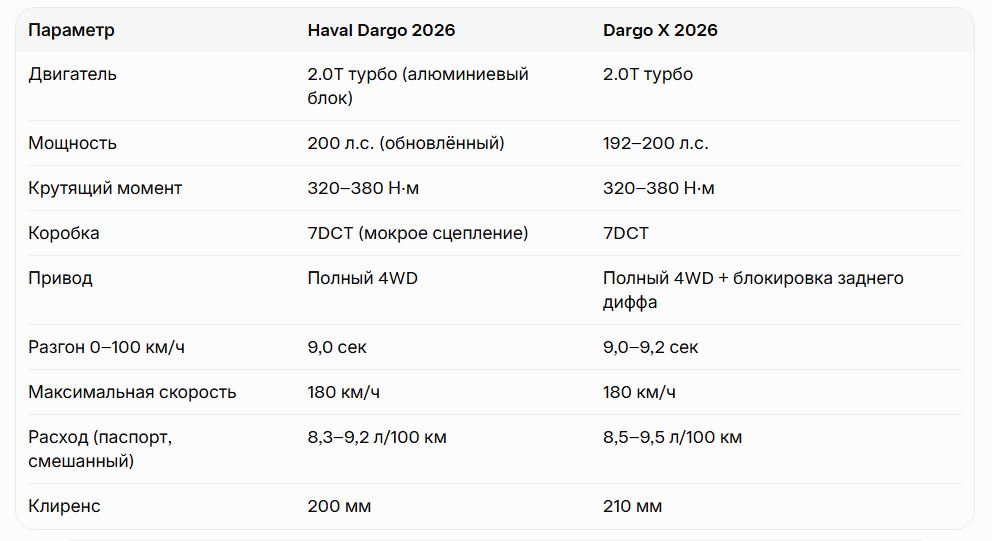 В апреле 2026 года в России стартовали продажи обновлённого (рестайлингового) Haval Dargo 2026 модельного года. Модель стала только полноприводной, получила более мощный мотор, новый дизайн и современную мультимедиа с Яндекс Авто. Dargo X — это отдельная «внедорожная» модификация с блокировкой заднего дифференциала, шноркелем и усиленной защитой.