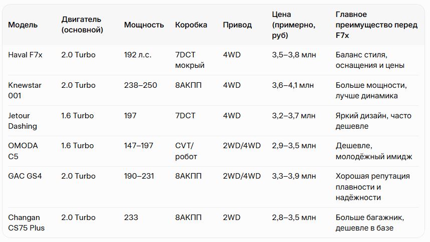 В 2026 году сегмент китайских купе-кроссоверов в России очень конкурентный, и Haval F7x остаётся одним из лидеров по соотношению цена/качество/оснащение.