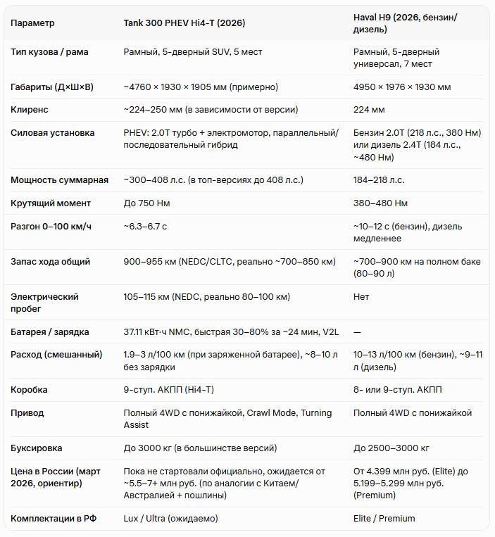 Tank 300 PHEV 2026 (Hi4-T, ~900–955 км хода) vs Haval H9 (бензин/дизель 2026) — рамный гибрид против классического внедорожника: что лучше?